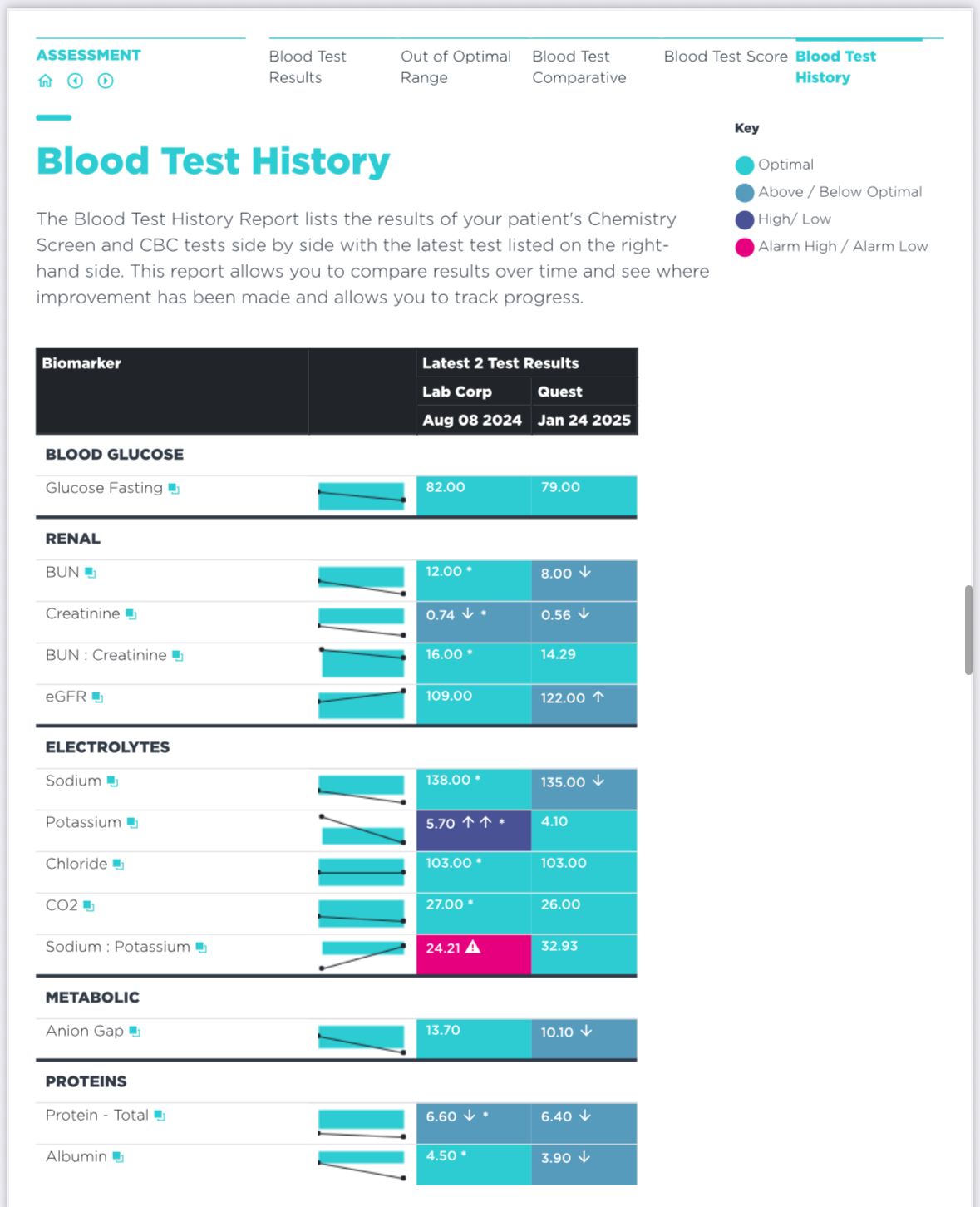 - Blood Test History (if more than one test date is provided) — Side-by-side comparison of your results over time to track progress, shifts, and trends.