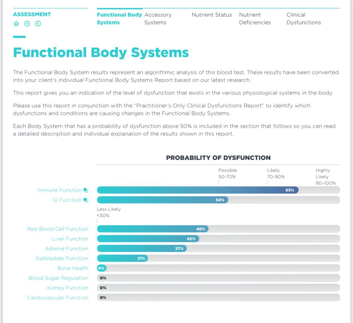 - Clinical Dysfunctions — Highlights likely health concerns based on algorithmic assessment through a functional medicine database, connecting patterns across multiple markers.