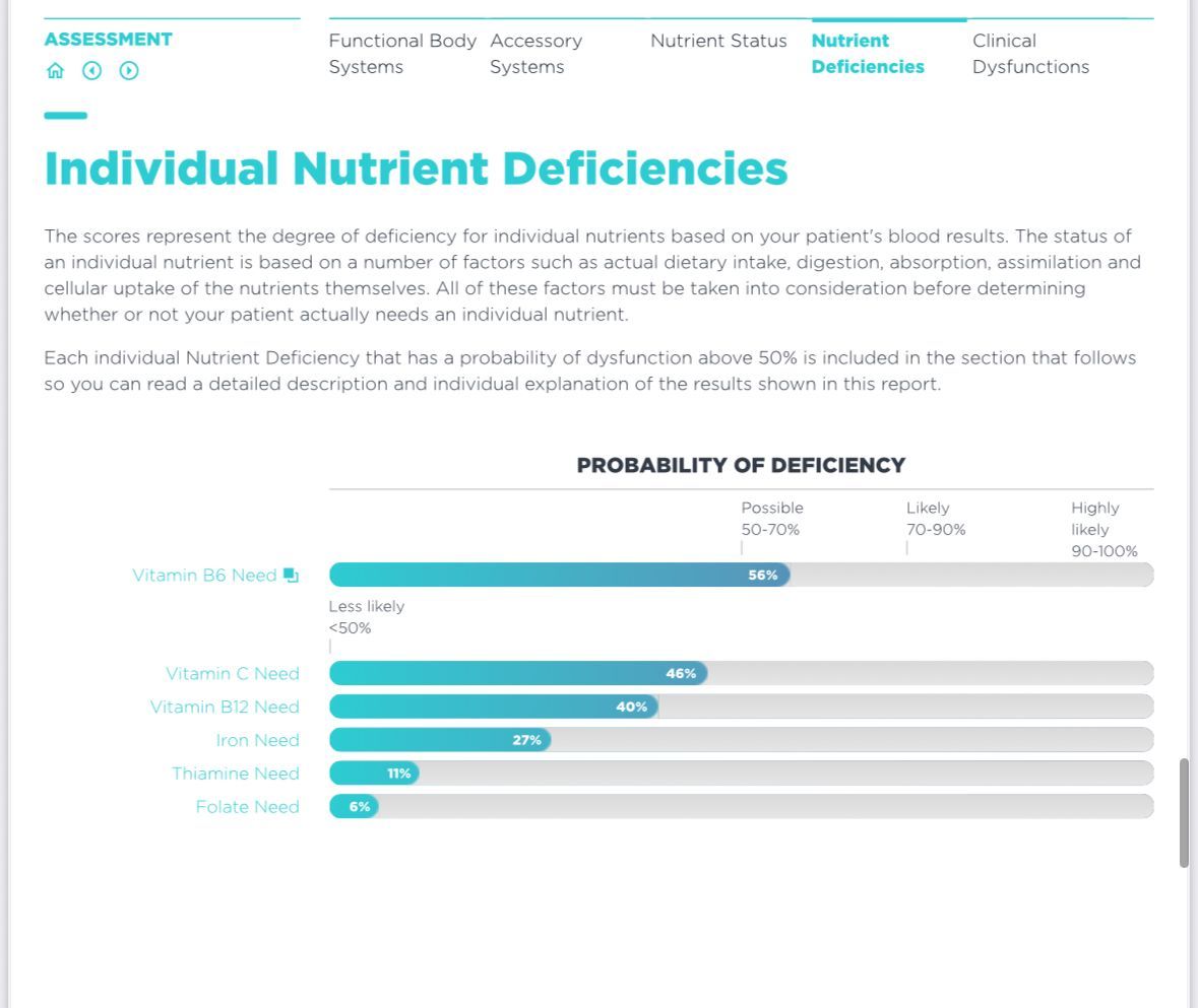 - Probability of Nutrient Deficiencies — Detailed report on 14 individual nutrients, pinpointing possible deficiencies or excesses based on your blood chemistry.