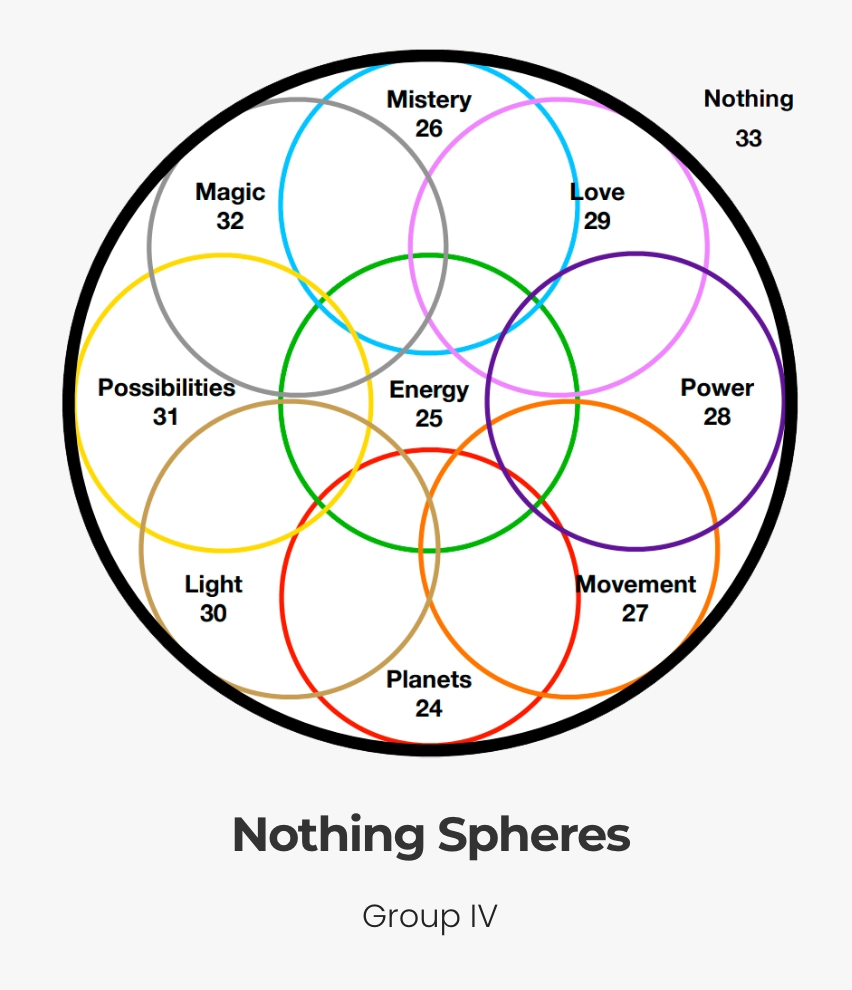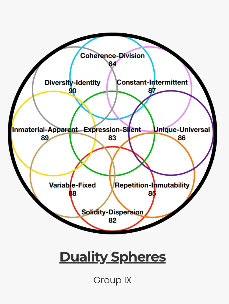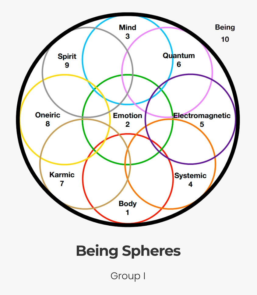 There are different spherical numerical and positional correlations that we have been describing in groups of three, six and nine, just as the I Ching does with trigrams and hexagrams. Line 10 would correspond to the non-line, that is to say, with the interspherical and extraspherical space. It does not correspond to any of the previous levels, but to all of them at the same time. What he does have is correspondence with his essential companion in the macrocosm that in turn also encloses from its space the Nothingness spheres, another group of 10. There are two other spheres that complete two groups of 10: the Flow spheres and Balance spheres, with which Being also shares a relationship. To be able to see the spheres reflection among themselves beyond what has been observed until now, we must take a more distanced perspective and thus observe the different spheres sets.