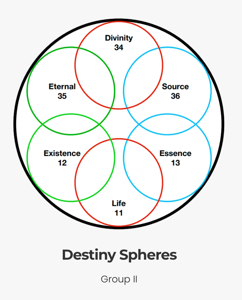 If we consider sphere 10 as the empty spatial location existing in and between all spheres, it does not correspond to any of the three terrestrial, energetic and celestial levels in which We categorize the sets of three spheres 1-2-3, 4-5-6 and 7-8-9 since it is in all and none. With which the next group of three spheres corresponds to that of the spheres 11-12-13, hence the correspondence of the essence 13 with the spheres 9-6-3 with which it shares a celestial nature. With what we are left with a structure of the first ten spheres, then a group of three (11-12-13) and the group of ten other universal spheres in which the first thirteen are projected, this is how the 23 spheres are grouped : 10-3-10. The first ten spheres of Being are projected in life-11, in existence-12 and in essence-13 and these in turn simultaneously reflect this projection in both the 10 spheres of Being and in the other 10 universal spheres. This is how the self-recreation formula we talked about works.