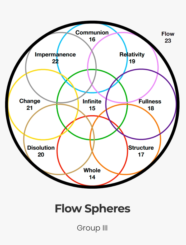 How is your direct relationship with the 13-essence and 36-source spheres? Direct relationship that exists between spheres 9 (spirit) and 13 (essence) occurs through sphere 10, as with spheres 11 (life) and 12 (existence). Sphere 10´s infinite space is the framework where these four spheres merge, giving rise to this particular relationship that allows, once the spherical space is completely cleaned, access to ten Flow spheres that are beyond sphere 13: sphere 14 (totality); sphere 15 (infinity); sphere 16 (communion); sphere 17 (structure); sphere 18 (fullness); sphere 19 (relativity); sphere 20 (dissolution); sphere 21 (change); sphere 22 (impermanence); and sphere 23 (flow). These 10 spheres prints everything lived reflection by the spirit throughout its existence through each being intrinsic essential information. All the contamination that we have been dissolving throughout the practice up to now has been reflected in them and they need to be restored to be able to move with the freedom spirit dream requires to be able to be carried out without conditioning.